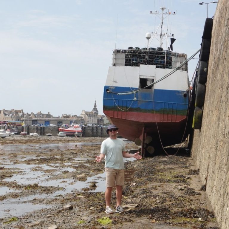 Am 10. August ging es weiter nach Roscoff. Der Schlag durch das Alderney Race forderte volle Konzentration. Delfine begleiteten uns, und zwischen den Kanalinseln übte ich Ukulele an Deck. Drei Tage lang erkundeten wir Altstadt, Markt, botanischen Garten, Strand und genossen Begegnungen mit anderen Seglern, darunter Ursula und Roger von der Merci und Frank und Antje mit ihrer Ovni. Faszniert hat uns der trockengefallene alte Hafen mit den großen Fischerbooten.